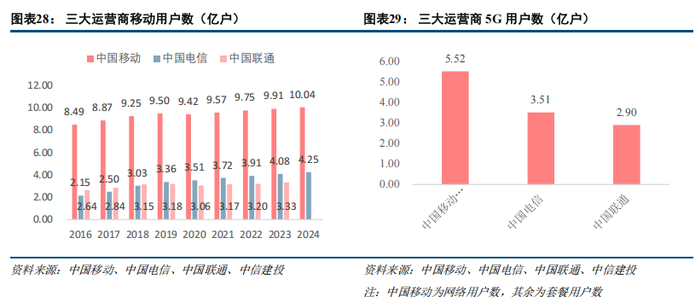 用户数小幅增长,运营商积极促进用户向5G迁转。2020年,受疫情、携号转网、低价值用户清理等因素的影响,中国移动、中国联通移动用户数出现负增长。2021年以来,通过发展融合用户,拓展用户第二卡槽等方式,三大运营商移动用户数实现稳健增长。截至2024年12月,中国移动、中国电信移动用户数分别为10.04、4.25亿户。5G用户方面,中国移动5G网络用户数为5.52亿户,中国电信、中国联通5G套餐用户数为3.51、2.90亿户。当前用户向5G迁转带来的ARPU提升已经越来越有限,运营商主要依靠各种增值应用以及权益产品销售拉动个人市场增长。工信部数据显示,运营商移动数据流量收入同比下降,反映个人市场发展压力大。