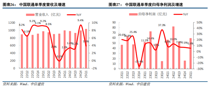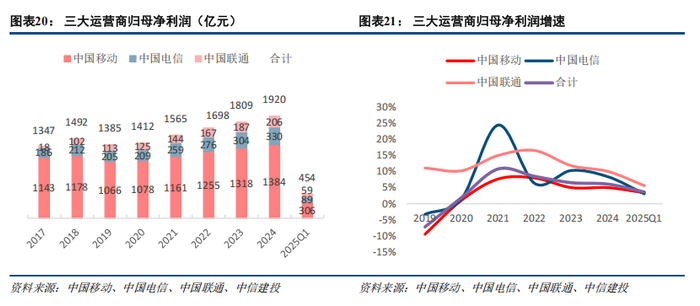 2025Q1,三大运营商合计实现营收5026亿元,同比仅增长0.8%。其中,中国移动实现营收2638亿元,同比增长0.02%;中国电信实现营收1355亿元,同比基本持平;中国联通实现营收1034亿元,同比增长3.9%。2025Q1,三大运营商合计实现归母净利润454亿元,同比增长3.7%。其中,中国移动归母净利润306亿元,同比增长3.5%;中国电信归母净利润89亿元,同比增长3.1%;中国联通归母净利润59亿元,同比增长5.6%。