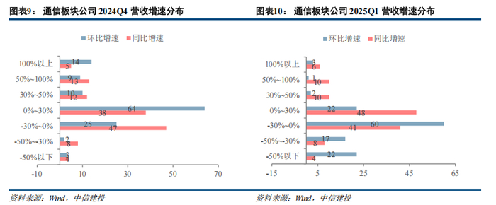 从营收增速分布来看,2024Q4同比正增长、负增长的公司分别有68家、59家,其中同比增速为-30%-0%和0%~30%的公司数量最多,分别为47家、38家,同比增速超30%的公司有30家。2025Q1,板块营收6371亿元,同比增长2.4%,从营收增速分布来看,2025Q1同比正增长、负增长的公司分别有74家、53家,其中同比增速为0%~30%和-30%-0%的公司数量最多,分别为48家、41家,同比增速超30%的公司有26家。特别说明:因通信行业受下游客户招标采购与执行节奏影响,及春节等假日影响,收入与利润存在较为明显的季节性波动,因此建议更重视同比数据,环比数据仅供参考。
