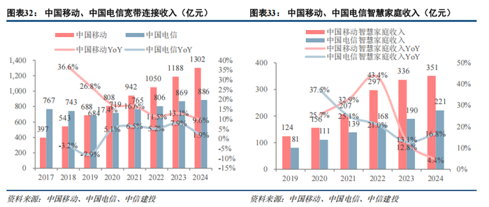 运营商积极发展智慧家庭业务,覆盖家庭教育、家庭办公、智慧家居、全屋智能、家庭安防等场景需求。2015年中国移动进入家庭宽带市场,凭借其优秀的渠道能力以及大力推广融合套餐(向已有的手机用户推广家庭宽带套餐),中国移动宽带连接业务增长迅速,在2019年收入规模便超过了中国电信,2023年以前一直保持双位数增长。当前,运营商家庭市场的增长主要来自两方面,一是用户向更高速率的带宽升级,例如从百兆升级到千兆,以及升级到FTTR;二是运营商向用户积极推广智慧家庭等应用,获取连接服务以外的收入。