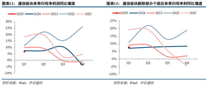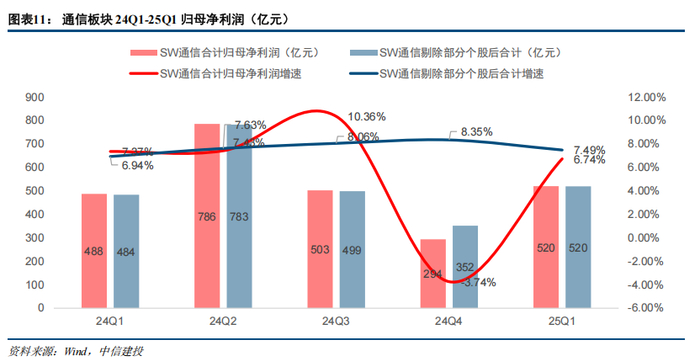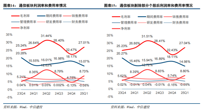通信板块2025Q1综合毛利率为27.01%,同比提升0.17pct,环比提升4.54pct;期间费用率为15.07%,同比下降0.48pct,环比下降3.10pct,其中销售费率为6.87%,同比下降0.23pct,管理费率为5.21%,同比下降0.09pct,研发费率为3.08%,同比下降0.07pct,财务费率为-0.08%,同比下降0.09pct;净利率为8.73%,同比提升0.37pct,环比提升3.98pct。剔除影响较大个股后,通信板块2025Q1综合毛利率为27.04%,同比提升0.18pct,环比提升4.61pct;期间费用率为14.98%,同比下降0.48pct,环比减少3.13pct,其中销售费率为6.87%,同比下降0.25pct,管理费率为5.19%,同比下降0.09pct,研发费率为3.00%,同比下降0.06pct,财务费率为-0.09%,同比下降0.08pct;净利率为8.80%,同比提升0.42pct,环比提升3.06pct。