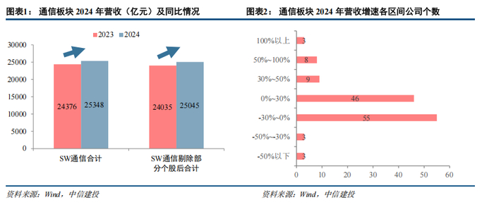 通信板块2024年营收实现平稳增长。2024全年,A股通信板块(申万通信指数成分股,下同)合计实现营收25348.15亿元,同比增长3.99%,如剔除非经常性损益影响较大的个股(见图表3,下同),合计实现营收25045.03亿元,同比增长4.20%。通信板块5成以上公司营收实现同比增长。营收增速分布方面,已披露业绩的127家中,2024年实现正增长的有66家,占比51.97%,其中收入增速0%~30%及-30%-0%区间的公司数量最多,分别为46、55家,分别占比36.22%、43.31%,营收增速超30%的公司20家,占15.75%。