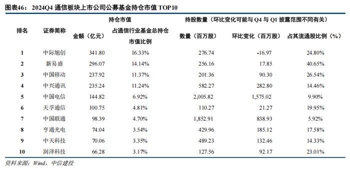 2025Q1,通信行业公募基金持仓市值前十大个股依次为:新易盛、中际旭创、中兴通讯、中国移动、中国联通、天孚通信、润泽科技、中国电信、中天科技、亨通光电,持仓市值占比通信行业公募基金持仓总市值的77.44%。新易盛、润泽科技、中际旭创公募基金持仓占其流通股超过10%,分别为22.60%、13.19%、11.82%。从前十大重仓来看,光模块/光器件、电信运营商仍是公募持仓重点板块。