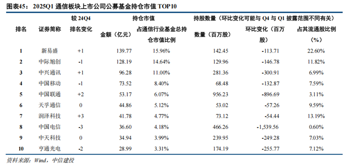 环比2024Q4,2025Q1通信行业公募基金持仓市值前十大个股未发生变化,仅名次发生变化。其中,润泽科技排名前进最多,由第10大持仓变为第7大持仓;中国电信排名下降最多,由第5大持仓变为第8大持仓。