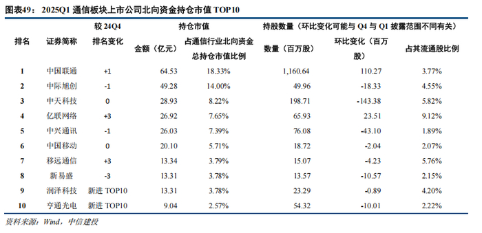 2025Q1,通信行业北向持仓市值前十大股依次为:中国联通、中际旭创、中天科技、亿联网络、中兴通讯、中国移动、移远通信、新易盛、润泽科技、亨通光电,其持仓市值占比通信行业北向资金持仓市值的75.22%。环比2024Q4,2025Q1通信行业北向资金持仓市值前十大个股中,润泽科技、亨通光电新进入TOP10;光迅科技、天孚通信退出TOP10。其余8家公司中,亿联网络、移远通信排名前进最多,分别由第7大持仓变为第4大持仓、由第10大持仓变为第7大持仓;新易盛排名下降最多,由第5大持仓变为第8大持仓。