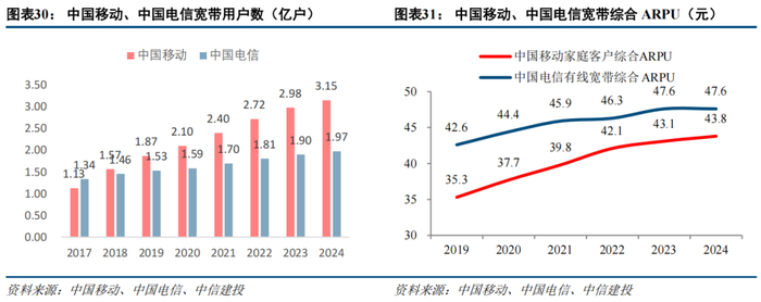 千兆宽带用户渗透率仍有提升空间,有望带动家宽ARPU增长。截至2025年2月末,三家运营商宽带接入用户总数达6.75亿户,比2024年末净增493.6万户。其中,100Mbps及以上接入速率的固定互联网宽带接入用户达6.41亿户,占总用户数的95%;1000Mbps及以上接入速率的固定互联网宽带接入用户达2.14亿户,比2024年末净增674.1万户,占总用户数的31.7%,占比较2024年末提升0.8个百分点。
