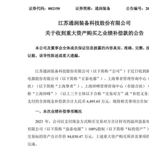 5月7日晚,通润装备(002150)发布关于收到重大资产购买之业绩补偿款的公告,显示因收购的标的资产业绩未达预期,交易对方正泰电器(601877)等相关方需向通润装备支付现金补偿合计4496万元。