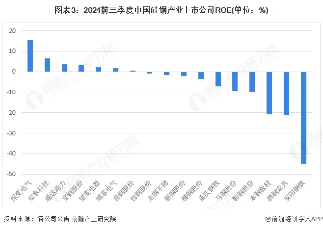 硅钢行业企业2024年前三季度ROE即净资产收益率中,各家企业的盈利能力差异明显。