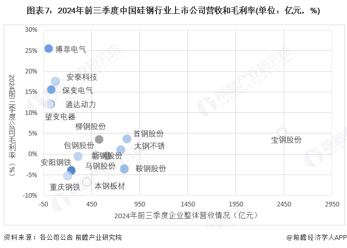 从企业2024年前三季度营收来看,收入最高的是宝钢股份,达2428.5亿元,毛利率为5.26%。硅钢相关产品有取向硅钢、无取向硅钢等,广泛应用于电力、家电等行业。收入排名第二的是首钢股份,前三季度达819.7亿元,毛利率为3.74%,主要产品是电工钢等,用于电机、变压器等生产。部分企业毛利率低于0,有鞍钢股份、安阳钢铁、包钢股份、本钢板材和重庆钢铁。