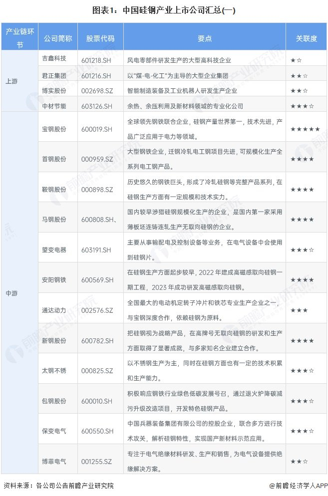 目前硅钢行业硅钢产业链上游企业众多,主要是硅铁、工业硅的生产企业,包括君正集团、鞍钢、新钢集团等,部分企业也涉及硅钢的生产。吉鑫科技主要专注于风电领域零部件生产,与硅钢产业直接关联较少。君正集团业务涉及硅铁冶炼等,硅铁是硅钢生产的原料之一,存在一定间接关联。博实股份在钢铁生产领域有智能化改造项目,与硅钢产业有一定间接联系。中材节能主要业务集中在节能和新材料等方面,与硅钢产业直接关联性较弱。生产燃料主要是国家能源集团以及地方能源集团企业。中游硅钢生产包括宝钢、首钢、太原钢铁、鞍钢、华菱钢铁、望变电气等。