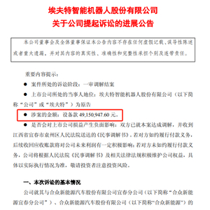 5月7日,埃夫特发布一则《埃夫特智能机器人股份有限公司关于公司提起诉讼的进展公告》。根据公告,被告合众新能源宜春分公司、合众新能源尚欠原告埃夫特设备款4915.09万元,同意自2025年6月至2025年11月按月偿还。