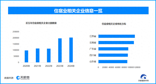 天眼查专业版数据显示,截至目前我国现存在业、存续状态的住宿业相关企业超156.1万家。其中,2025年截至目前新增注册相关企业约8.9万余家,从企业注册数量趋势来看,近五年间,住宿业相关企业的注册数量呈现出增长态势,特别在2023、2024两年呈现出显著的增势。 从区域分布来看,江苏省、云南省、广东省住宿业相关企业数量位居前列,分别为11.2万余家、10.9万余家和9.2万余家。