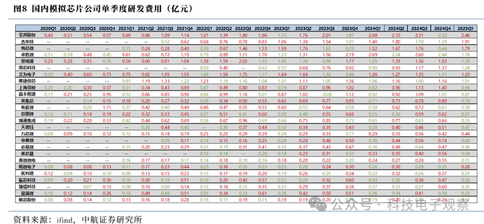 多数公司在25Q1的研发投入环比减少,从历史Q1观察,或为季节性波动。研发投入靠前的公司为圣邦股份、杰华特、卓胜微(2.46亿元、1.91亿元、1.79亿元),靠后的公司为敏芯股份、富满微、臻镭科技(0.17亿元、0.22亿元、0.25亿元)。