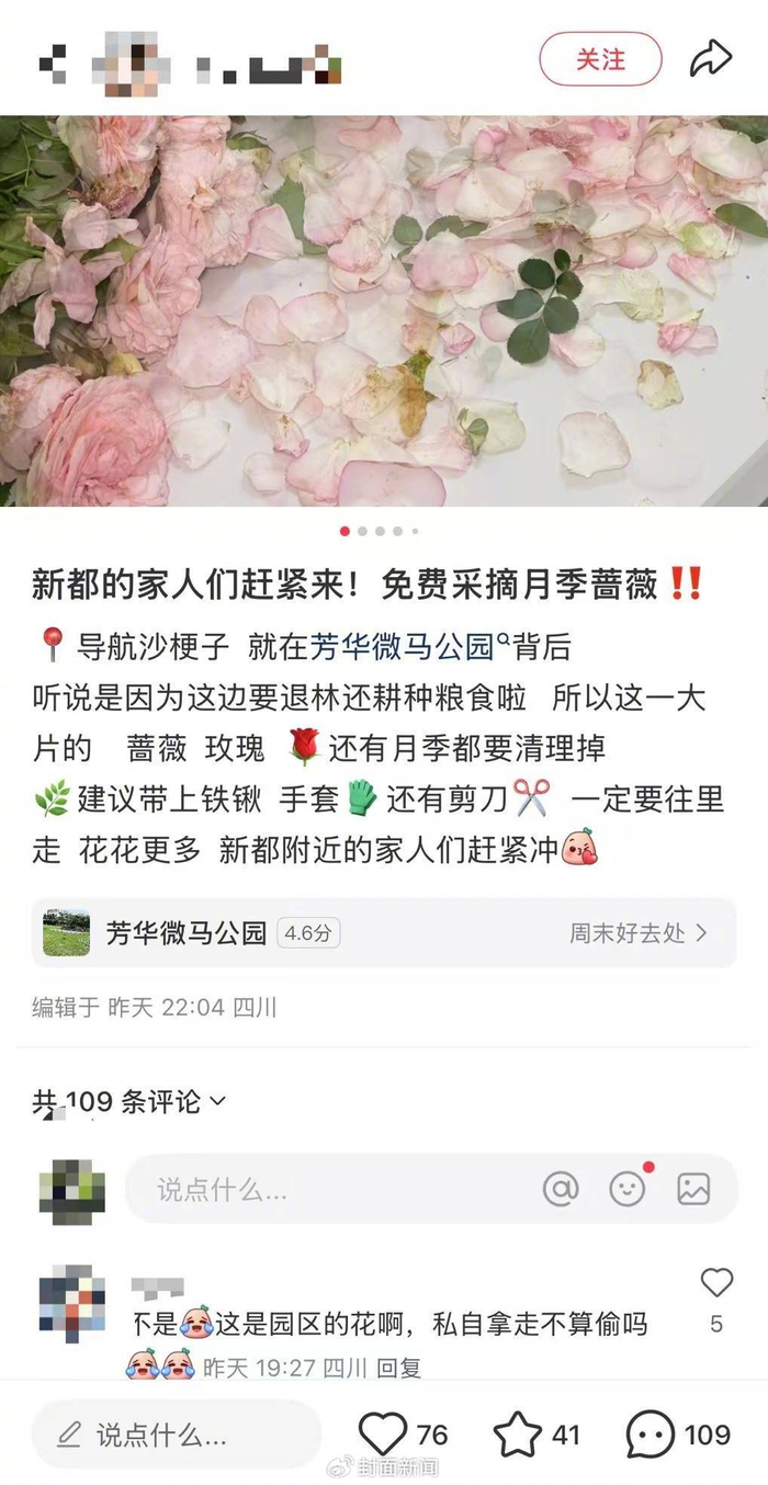 从5月初开始,社交平台上,就出现了“成都这里免费挖花”“沙梗子免费挖花”等帖子,帖文中,有到过现场采摘了花束的人,得意洋洋地分享起自己的“战果”。