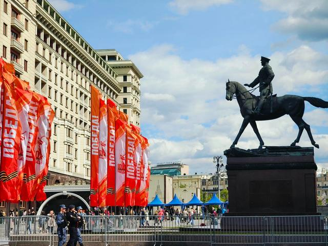 5月6日,俄罗斯莫斯科,图左侧莫斯科红场附近的“胜利旗帜”与图右侧俄罗斯国家历史博物馆前的朱可夫元帅雕像相得益彰。中青报·中青网驻俄罗斯记者 赵祺/摄