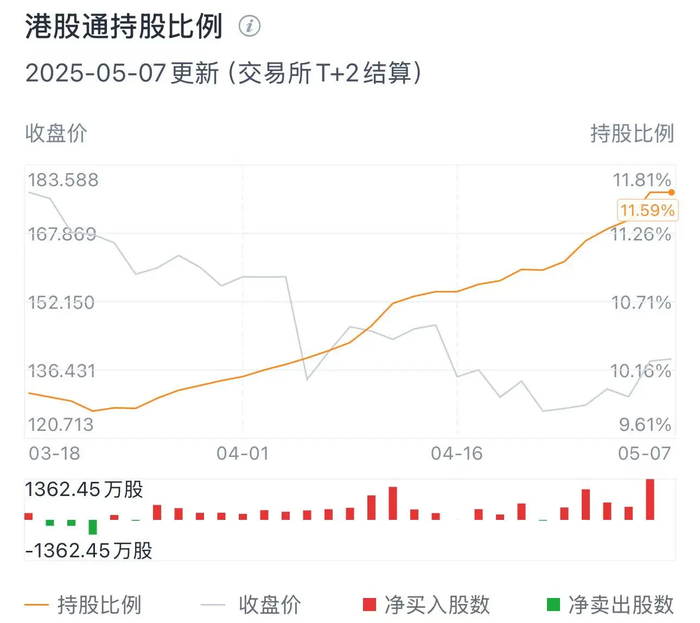 但据Wind数据显示,截至5月7日,港股通南向资金自4月以来持续流入美团,期间累计增持高达9059.50万股,持股比例也从10.11%攀升至11.59%。按照期间均价计算,累计加仓金额逾120亿港元。