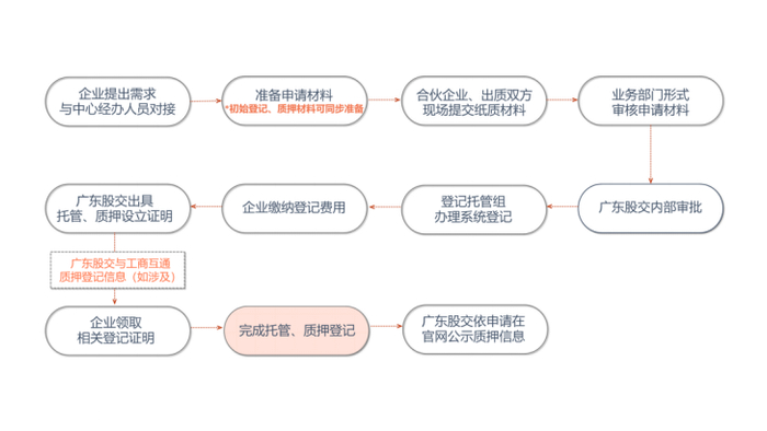 (一)政策支持:广东省地方金融监督管理局、广东省市场监督管理局联合出台试点性支持政策,鼓励省内注册的有限合伙企业到广东股权交易中心办理财产份额托管、出质登记业务,有效填补上位法律法规制度以及有限合伙企业财产份额质押登记场所空白。