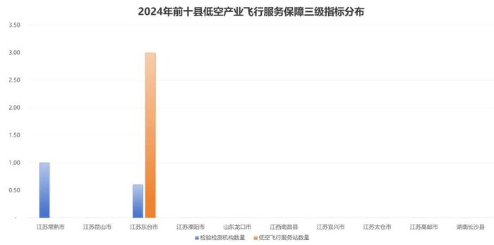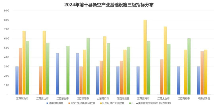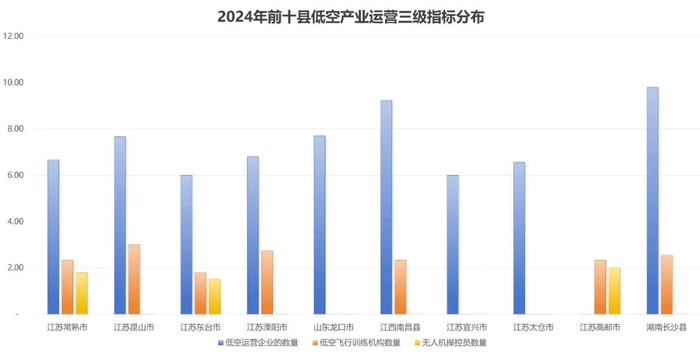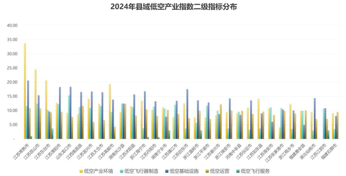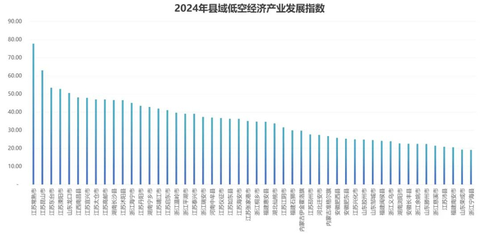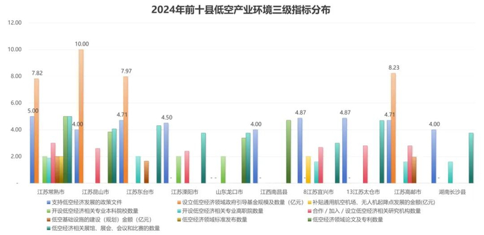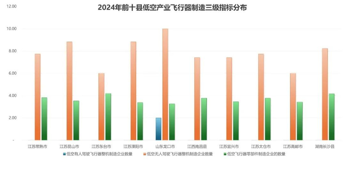 从县(县级市)的角度来看,江苏常熟市、昆山市和东台市位列前三,江苏溧阳市、山东龙口市、江西南昌县、江苏宜兴市、太仓市、高邮市和湖南长沙县紧随其后。县域低空产业发展指数得分前10位的县有7个在江苏省,显现了江苏县(县级市)低空经济领域较强的参与度,在低空产业环境、低空基础设施和飞行器制造等维度优势明显。