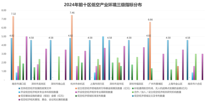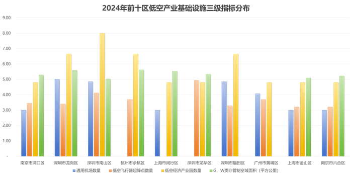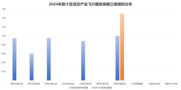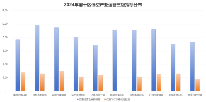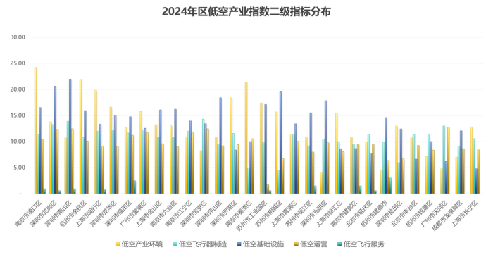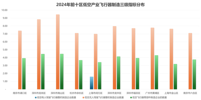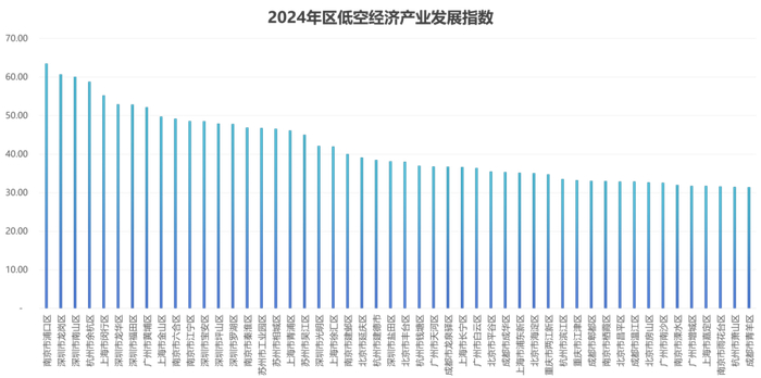 从市辖区的角度来看,南京市浦口区得分最高,其他得分前10位的市辖区为:深圳市龙岗区、南山区、杭州市余杭区、上海市闵行区、深圳市龙华区、福田区、广州市黄埔区、上海市金山区和南京市六合区。深圳、南京、上海等地的市辖区排名靠前,低空经济发展相对领先,但又各有侧重:南京市浦口区、杭州市余杭区在政策扶持、产业生态构建等方面优势明显;深圳市宝安区、南山区在航空制造技术、产业集聚等方面优势明显;深圳龙岗区等则在机场、起降点等基础设施建设较为完备。