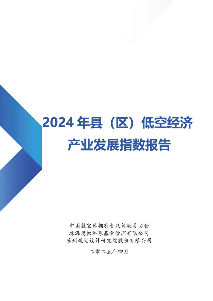 近日,苏州规划设计研究院股份有限公司联合中国航空器拥有者及驾驶员协会(AOPA)与珠海奥帕私募基金管理有限公司(奥帕基金),重磅发布《2024年县(区)低空经济产业发展指数报告》,旨在通过科学的指标体系,系统评估全国县(区)低空经济发展水平,为地方政府决策、企业布局及投资者提供参考。