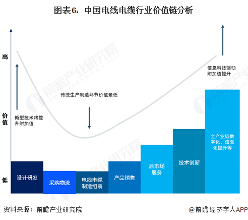 我国电线电依据技术难度高低、供需现状及潜力,电线电缆行业价值链呈“重心后移”趋势。其中,传统生产制造环节的价值最低,而随着信息化与数字化不断推进电线电缆企业的转型,产品销售、后市场服务、创新模式及全产业链数字化信息化的价值不断上升。