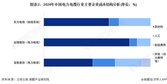 前瞻统计了中国电线电缆行业中,电力电缆领域三家竞争力较强的上市公司制备成本数据,可以看出,电力电缆的原材料成本较高,东方电缆、远程股份和宝胜股份的电力电缆业务原材料成本占比都超过了95%,制造费用相对较低,在1%至3%不等,人工成本占比最低,在0.7%至2.1%范围内。