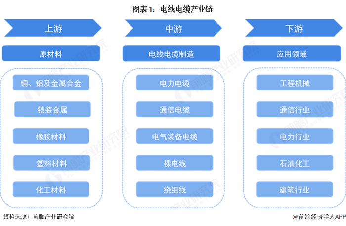 电线电缆作为机械工业主要的产品,经过数十年的发展,我国电线电缆行业产业链较为成熟,上游行业主要为提供制造电线电缆产品原材料的基础材料行业,如铜、铝及其合金;制造交联绝缘套及护套料的橡胶行业,聚乙烯、聚氯乙烯化工行业等;中游是电线电缆制造的核定环节,包括提供电力电缆、通信电缆、电气装备用电缆及裸电线、绕组线等其他类型电缆的电线电缆生产制造企业;下游主要为对电线电缆有需求的行业,如工程机械、通信行业、电力行业及建筑行业等。