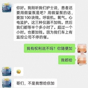 周先生介绍,对方的态度一直不错,只是要发车时,对方又以多等了时间和需要加医疗设备为由要求加钱,不然不走。无奈,自己又加了100元,对方才发车。
