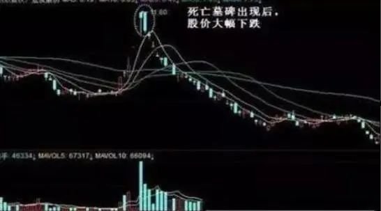死亡墓碑,由两根K线组成,第一根为大幅震荡的高开低走阴线,一般为锤头线或T字线,第二根为一根长阴线,高位连续的两根阴线,如同主力为散户竖起的一座墓碑,K线组合如下图所示。