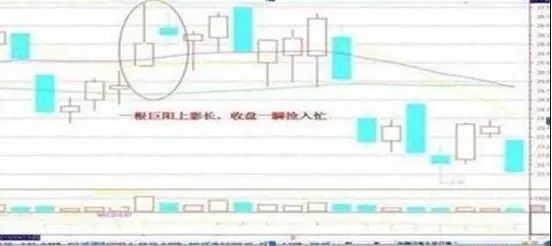 口诀五:一根巨阳上影长,收盘一瞬抢入忙。