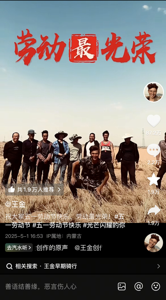 杨先生介绍,他看到王金在4月上旬拍摄的视频,在平台引发一定关注后,主动联系王金,提出帮助他孵化、运营账号,“他之前是在内蒙古帮人开车的,治沙的内容,算是我们给他立的人设,因为这个赛道做的人不多,而且又是正能量。”