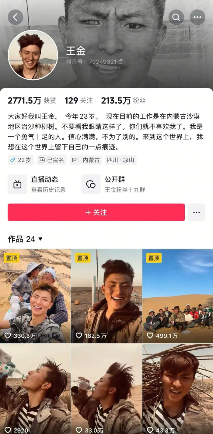 王金曾在采访中透露,他今年23岁,父母如今在内蒙古种柳树,4月初他也来到内蒙古和父母一起。王金称:“拍视频只是为了记录生活,没想当网红。”
