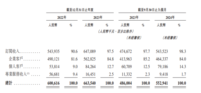 据招股说明书显示,群核科技的收入主要来自软件的订阅收入, 2024年前三季度其营收占比为98.30%。而其中又分为企业客户和个人客户,企业客户贡献的营收比例高达总收入的八成,是营收贡献的主力军。