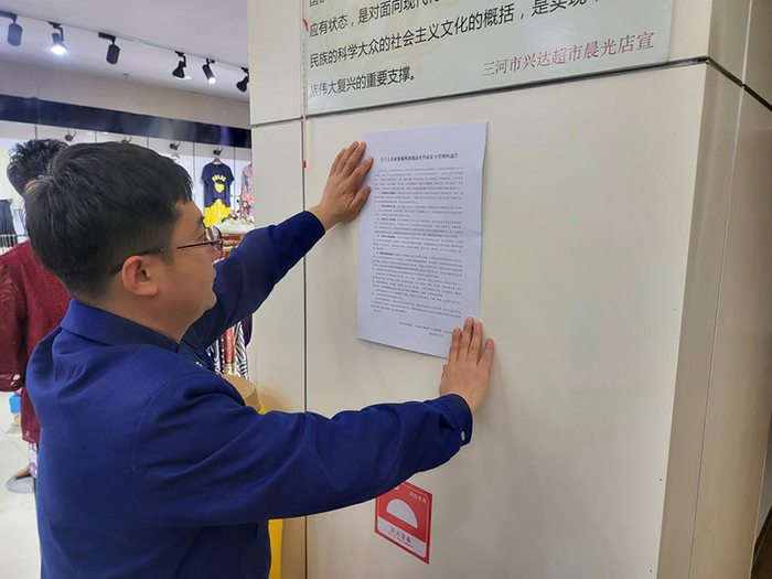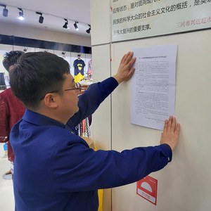三河市消防救援大队印制千余份《关于人员密集场所加强动火作业安全管理通告》,结合宣讲队走进商场、超市、娱乐场所、宾馆酒店等各类人员密集场所,在场所入口、公告栏、显眼通道等显著位置张贴《关于加强人员密集场所动火作业安全管理的通告》,督促场所负责人明确动火作业安全管理各项措施,严格按照规定执行动火作业审批制度。
