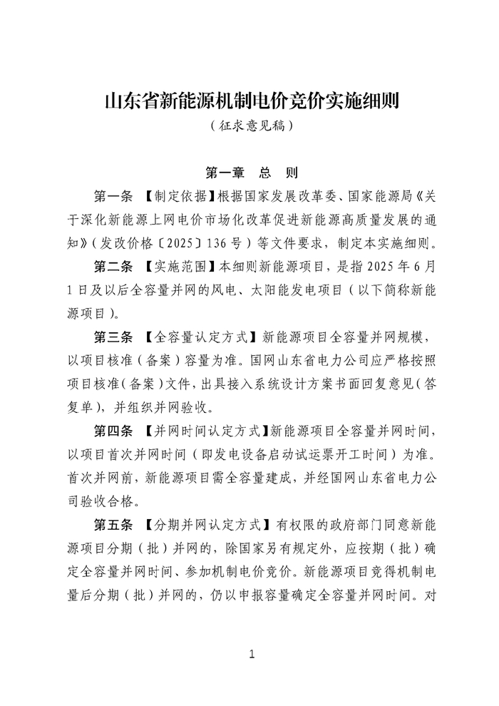 《山东省新能源机制电价竞价实施细则(征求意见稿)》明确了新能源全容量认定方式、并网时间认定方式、分期并网认定方式等。