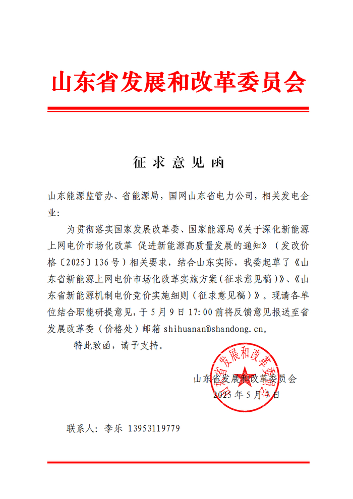 近日,山东省发改委正式就《山东省新能源上网电价市场化改革实施方案(征求意见稿)》《新能源机制电价竞价实施细则(征求意见稿)》面向能源监管机构、电网企业及发电企业公开征求意见。