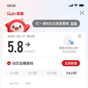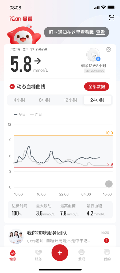 值得一提的是,三诺动态血糖仪二代还拥有高/低血糖异常提醒和24小时全天候服务,能很好地帮助我这种“小白”糖友发现隐匿性高/低血糖。规避健康风险。我之前还没注意,是某次我凌晨一点半突然出现了低血糖情况,当时被手机振醒后我发现爱看健康app提示我血糖偏低,我一时不知道该怎么办,就在app上的控糖服务群给客服发消息询问,没想到客服非常迅速地回复了我,告诉我如何补糖、之后如何操作,让我很是安心。第二天上午,群里的健康管理师还针对我的血糖变化对我的控糖方案提出了新的建议,真的是帮了我大忙!