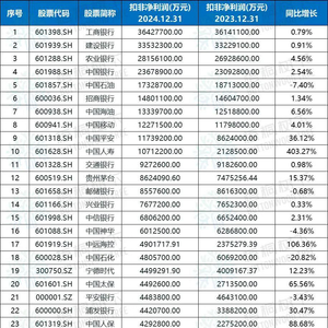 这5402家公司中,共计3795家公司在2024年度实现盈利,工商银行(601398.SH)以3642.77亿元的扣非归母净利润占据榜首,较2023年同比增长0.79%;1607家公司扣非归母净利润为负,其中万科A(000002.SZ)亏损高达453.94亿元,扣非净利润垫底,同比变动-563.49%。
