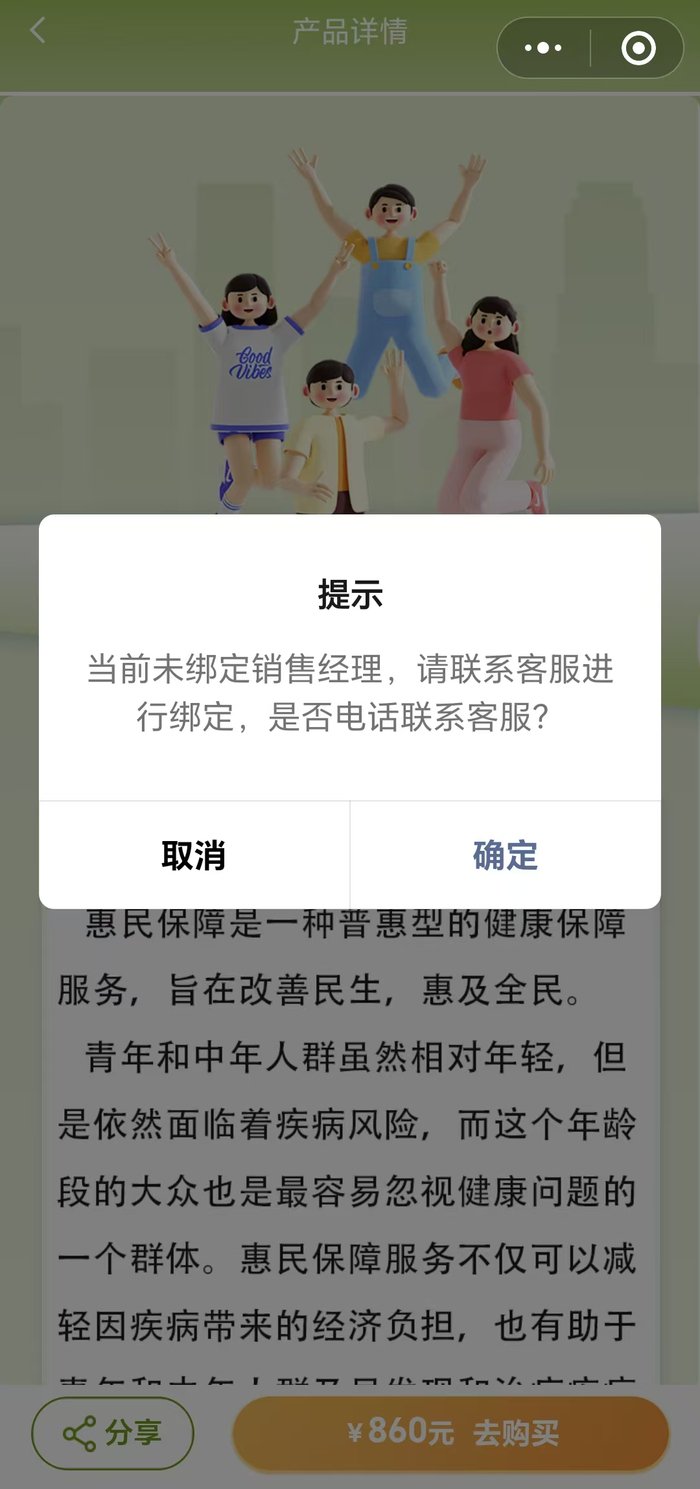 记者搜索到一款名为“屹腾惠民”的小程序,标识跟宣传单上一致,主体公司为大连屹腾惠民健康生态科技有限公司(以下简称“大连屹腾”)。注册信息时需要输入姓名、身份证号、身份证地址、手机号、职业、有无医保、过往病史等信息,填好后跳出产品价格860元,且页面弹出提示称“未绑定销售经理,请联系客服进行绑定”。不过,记者在五一假期前后多次拨打客服电话,电话均处于无人接听状态。