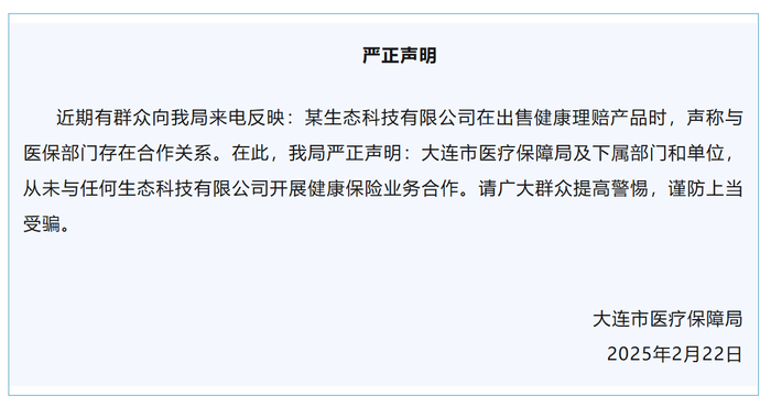 今年2月22日,大连市医保局发布严正声明:“大连市医疗保障局及下属部门和单位,从未与任何生态科技有限公司开展健康保险业务合作。请广大群众提高警惕,谨防上当受骗。”