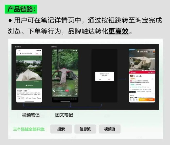 这一合作呼应了一些用户的产品使用方式——在小红书种草、到其他电商平台搜索并交易,特别是在小红书发力电商业务之前。不同的是,那时需要用户手动在不同App之间进行切换,属于自发行为;这一次,小红书笔记下方新增“广告挂链”功能、实现直接跳转,通过官方的产品升级“过了明路”。