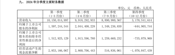 这种情况下,第四季度的营业收入数额明显小于其他3个季度;而净利润和扣非净利润在前三个季度保持在10-20亿元区间的情况下,出现较大额度亏损。