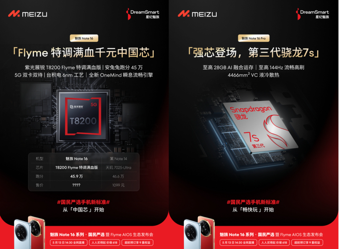 【新机】魅族Note16/Pro处理器公布 紫光展锐T8200/骁龙7sGen3