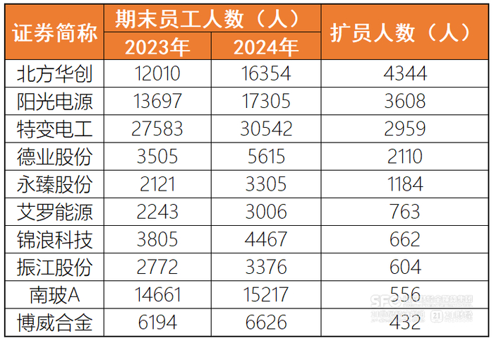 不过,亦有光伏企业在2024年逆势招人。例如,光伏设备公司北方华创,2024年扩招4344人;“光储一哥”阳光电源,2024年则增加3608人。