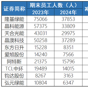 在去年行业流失的14万从业人员中,来自头部一体化龙头企业的人员数量占比较多。例如,隆基绿能晶科能源天合光能晶澳科技,这些公司年末在职人员数量较2023年都缩减超过1万人,其中隆基绿能晶科能源缩减人数则超过2万人。