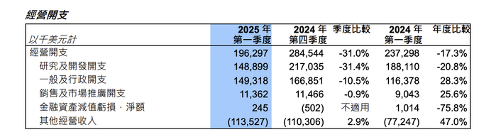 其中,今年一季度的研究及开发支出从2024年第四季度的2.17亿美元,减少至1.49亿美元;一般及行政开支从2024年第四季度的1.67亿美元,减少至1.49亿美元。