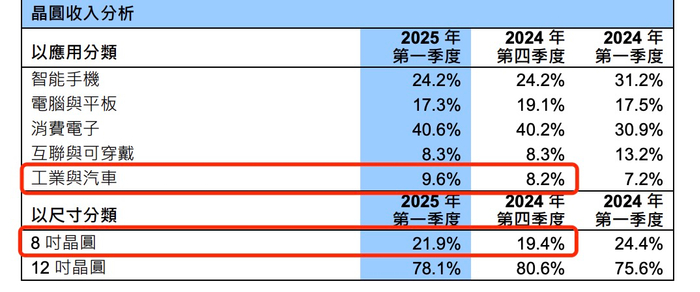 从收入应用分类也可以看到,在2025年一季度,智能手机、消费电子、互联与可穿戴业务收入占比与2024年Q4相比基本持平,而工业与汽车收入占比环比提升明显,至9.6%。