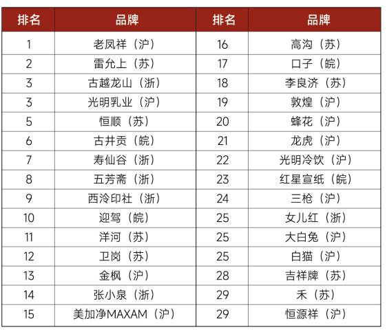 综合表现最为突出的前10个品牌依次为老凤祥、雷允上(苏州)、古越龙山、光明乳业、恒顺、古井贡酒、寿仙谷、五芳斋、西泠印社(杭州)、迎驾贡酒;排名11-20的品牌分别为洋河、卫岗、金枫、张小泉(杭州)、美加净MAXAM、高沟、口子窖、李良济、敦煌、蜂花;排名21-30的品牌分别为龙虎、光明冷饮、红星宣纸、三枪、女儿红、大白兔、白猫、南京云锦、稻香村(苏州)、恒源祥。