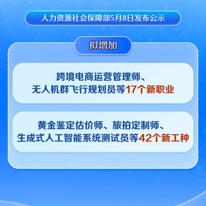 人力资源社会保障部5月8日发布公示,拟新增跨境电商运营管理师、无人机群飞行规划员、电子电路设计师、装修管家、咖啡加工工等17个新职业。