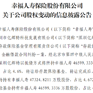 幸福人寿:股东深圳亿辉特以抵债方式将所持约4.66亿股股份转让给存款保险基金